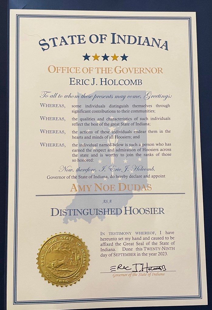 In 2023, Governor Eric J. Holcomb recognized Amy Dudas as a Distinguished Hoosier. Through significant contributions to her community, Amy has been honored as an individual who reflects the best of Indiana and has earned the respect and admiration of the citizens of the state of Indiana.